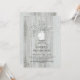 Convite de aniversário de madeira branca e elegante apresenta luzes de cordas, jarro de pedras com etiqueta e iniciais, e flores de respiração de bebês.