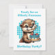 Convites de aniversário para a festa de aniversário de um menino. Ótila de desenho em azul e turquesa com bolos de aniversário, chapéus de aniversário com presentes e sendo super fofa!
