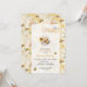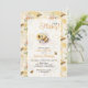 This honeycomb baby shower invitation features a “A Little Honey” theme with a cute bee holding a sunflower, surrounded by flowers and bees on a warm honeycomb background. The sweet and playful design makes it a perfect personalized invitation.
