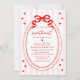 Celebrate a sweet new arrival with this charming sweetheart baby shower invitation featuring the phrase “A Little Sweetheart Is on the Way!” in elegant red lettering. Your baby shower details are displayed below and framed by a hand-drawn scalloped frame topped with a whimsical red bow for a vintage-inspired touch. A soft pink and white striped background is accented with scattered red hearts, creating a playful yet refined look. Designed for Valentine’s Day or sweetheart-themed baby showers, this invitation is perfect for celebrating a baby girl with classic charm and romantic flair. Personalize the wording to create a memorable invitation for a February or a sweetheart-themed baby shower.