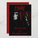 Um crânio mascarado vestido com capa preta encapuzada e uma mão enovelada negra convidando-o a vir. Uma cortina de marrom é usada como pano de fundo nesta foto. Um convite excelente. Personalize com suas próprias informações.