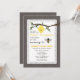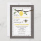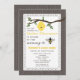 Um convite do chá de fraldas que caracteriza uma grão de madeira inspirou o fundo em ambos os lados. As características dianteiras atam o centro inspirado com ilustração de um ramo de árvore com a colmeia na parte superior. Ilustração da abelha do mel com texto customizável. Artigos de harmonização Look for no Paperie de Jill.