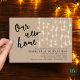 Nosso novo cartão de convite de festas de casa, de aquecimento doméstico, no moderno tema das luzes de cordas castanhosas da cabeceira rustica. Planejar uma festa para celebrar sua nova casa com sua família e amigos? Convide seus hóspedes com este cartão de convite de festas de inauguração.