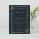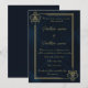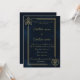 Este sofisticado modelo de convite captura a opulência atemporal da era Art Déco. Situado contra um fundo azul profundo e texturizado, o design apresenta uma impressionante moldura dourada geométrica composta por linhas limpas e paralelas. O destaque da peça são os motivos estilizados e angulares de orquídeas nos cantos superior esquerdo e inferior direito, misturando formas florais orgânicas com precisão arquitetônica. É uma escolha ideal para eventos de alta classe, casamentos de gala ou noites de gala onde luxo e elegância discreta são os temas.