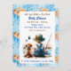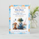 Uma ilustração adorável e doce da aquarela de um bebê pescando com um cachorrinho. As cores desses convites incluem azul e laranja.