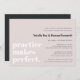 Nosso moderno e humorístico janto de ensaio de casamento ou convites de festas de coquetel apresentam "prática é perfeita" em letras retrorreflectoras brancas em um fundo cinza. Personalize com seu ensaio de cerimônia e ensaie os detalhes do janto alinhados à direita. Inclui espaço para a época do ensaio e endereço da igreja ou do local. Um design de chic para casais modernos e eventos elegantes com uma língua no sentido de humor bochecho.