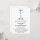 Celebre o dia especial do seu filho com estes na moda e sofisticados convites de primeira comunhão. Apresentando um belo fundo azul-d'água, um delicado design e um toque de folha de ouro, esses convites são perfeitos para uma celebração moderna e elegante. O design é personalizável para corresponder ao tema e à paleta de cores do evento.