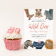 Primeiro convite de aniversário de uma criança bonita e divertida com ilustração de animais safari de girafa, leopardo-da-neve, rinoceronte, leão, elefante e zebra com flores, coroas e chapéus de festas cor-de-rosa. O texto diz "Wild One". Perfeito para a festa de primeiro aniversario de uma menina.
