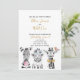 Seu bebê está virando um! Convide seus convidados especiais com este adorável convite neutro de gênero que inclui animais selvagens de festa feitos à mão em preto e branco. O nome do bebê, "Wild One" e a data estão em tipografia de script com letras douradas, e personalizada em um sans negro moderno, chic. A parte traseira da placa apresenta um design de verificação giro, preto e branco, desenhado à mão. Copyright Elegant Invites, todos os direitos reservados.