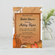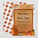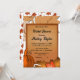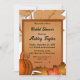 Este elegante chá de panela de outono é perfeito para um moderno chá de panela de outono. Os simples design incluem folhas de outono e uma abóbora com elegante tipografia preta num fundo de madeira rústica.