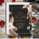 Ação de graças janta convite de festas com folhas de outono e flores em um fundo preto elegante.