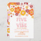 Retro inspirou Cinco é um convite de aniversário de 5 Vibe com flores de estilo 70 e fontes e cores de som.