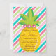 Um deleite tropical, este convite para casamento do abacaxi e do arco-íris apresenta um fundo riscado diagonal rosa e azul com um abacaxi amarelo colocado no meio do convite para o casamento. As informações da cerimônia são escritas dentro do abacaxi usando uma fonte preta. Perfeito para um casamento de verão, compre estes adoráveis convites de casamento hoje! Design do convite: WeddingsbyRhoadie Background stripes: AMBilustrações http://www.etsy.com/shop/AMBillustrations/ Pineapple e flores: Prettygrafik design (https://www.etsy.com/shop/Prettygrafikdesign)