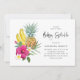Um convite para bebês tropicais colorido, com ilustração aquosa do abacaxi, bananas, plumerias e hibisco rosa quente. Adicione os detalhes dos eventos. Este convite tropical floral é perfeito para o verão e para o bebê luau.