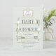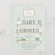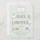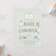 Um convite de chá de bebê neutro em verde-sálvia moderno, apresentando uma moldura pendurada com a mensagem "estamos abastecendo as prateleiras" acima de uma trio de prateleiras de madeira empilhadas com suportes, preenchidas com itens de berçário como uma planta suculenta em vaso, livros infantis, brinquedos de madeira, um cesto de fraldas, cesta listrada, caixas empilhadas e um frasco de loção infantil. Parte da coleção "Abasteça as prateleiras" de Stacey Meacham. Visite sua loja para mais itens coordenados, bem como outras opções de cores para um chá de bebê neutro ou para menino.
