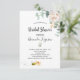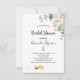 Um convite para uma noiva. Um fundo branco chic. Decorados com flores brancas de cor aquosa (pénia) de eucalipto verde, folhas e prigos, e um doce e feliz carregando de abelhas e um envelope. Personalize e adicione um nome e detalhes da parte. Letras negras. O texto: Chá de panela e o nome da noiva a ser é escrito com um moderno estilo escrito à mão. Volta: cor verde de fundo e a abelha sorridente feliz.