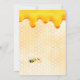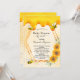 Um chá de fraldas de verão divertido por correio. Um fundo amarelo com um padrão alveolado. Com uma falsa estrutura geométrica de ouro e mel doce pingando. Decorado com girassóis amarelos e laranja e abelhas-desabrochadas felizes. Uma abelha é carregando envelope. Com o texto: Chá de fraldas por correio. Personalize e adicione o nome da mãe a ser escrita com um estilo moderno, escrito à mão. Letras negras. Volta: padrão amarelo de mel, pingos de mel e um desenvolvimento de carregando de abelhas. .
