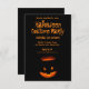 Convite para festas de Dia das Bruxas laranja e preto com imagem brilhante de abóbora.