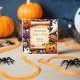 O design apresenta um pergaminho envelhecido no centro, fornecendo um espaço de vazio para o texto. Ao redor do pergaminho estão vários ícones do Halloween, incluindo lanternas sorridentes, fantasmas com diferentes expressões, milho doce, lábios coloridos de Halloween, aranhas pretas e morcegos. O fundo é um roxo profundo com padrões sutis, criando uma atmosfera lúdica e assustadora perfeita para um convite de Halloween.