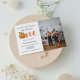 Um cartão de convite de aniversário elegante e moderno com uma abóbora laranja queimada com folhas de outono. De acordo com o texto, "nossas pequenas abóboras estão virando uma."
