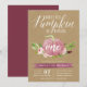 Enamorese destes convites de aniversário fofos. O design apresenta uma abóbora em aquarela rosa adornada com flores burgundy e marfim e folhagens verdes em um fundo kraft rústico. "Nossa pequena abóbora está fazendo" aparece no topo em letras de caligrafia sofisticada, com a idade do seu filho inscrita na abóbora. A amostra mostrada é para o primeiro aniversário. Personalize com os detalhes da sua festa de aniversário abaixo em letras brancas. O verso dos cartões é burgundy marsala sólido.