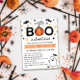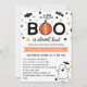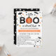 Chá de fraldas Adorável de Halloween em branco, cor de laranja e verde, com um pequeno boo quase está escrito no topo, com uma abóbora substituindo um dos o e cercado por morcegos e estrelas. Um fantasma bonitinho está comemorando o convite para o chá de fraldas do templo da abóbora.