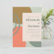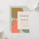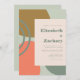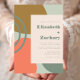 This modern design features abstract flowing shapes in shades of muted dark green, gold and orange on a pale sage green background. Personalize it with the names of the bride and groom in chunky typography and the wedding details in dark green text on a pale blush rectangle.