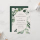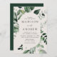 Convites elegantes de casamento com os detalhes de seu casamento aninhados em um quadro oval cercado por eucalipto, samambaias e outros ricos verdes com um fundo creme. Os convites de casamento botânico modernos revertem para um sólido fundo verde escuro. Projetado para coordenar com nossa coleção de casamento Abundant Greenery.