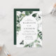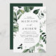 Convites de casamento elegantes com os detalhes do seu casamento aninhados em uma estrutura oval cercada por eucalipto, samambaias e outros ricos verdes. Os convites de casamento botânico modernos revertem para um sólido fundo verde escuro. Projetado para coordenar com nossa coleção de casamento Abundant Greenery.