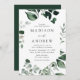 Convites de casamento elegantes com os detalhes do seu casamento aninhados em uma estrutura geométrica cercada por eucalipto, samambaias e outros ricos verdes. Os convites de casamento botânico modernos revertem para um sólido fundo verde escuro. Projetado para coordenar com nossa coleção de casamento Abundant Greenery.
