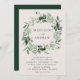 Convites elegantes de casamento com seus nomes cercados por uma coroa de eucalipto, samambaia e outros ricos verdes com seus detalhes de casamento mostrados abaixo em um fundo de cor creme. Os convites de casamento botânico modernos revertem para um sólido fundo verde escuro. Projetado para coordenar com nossa coleção de casamento Abundant Greenery.