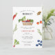 Cute feira de produtores alimentos frescos inspirados frutas e legumes pintados à mão Acabado de chegar ao mercado Convite de Chuva de Presentes com padrão de toalha de mesa xadrez vermelha e branca ao fundo.