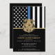 Honre a dedicação e o trabalho de duro de um novo oficial de polícia com este convite de formatura policial personalizável. Apresentando um crachá policial e a bandeira da polícia com riscas brancas e pretas e uma orgulhosa linha azul fina, esta design simboliza força, serviço e sacrifício. O convite é personalizado com o nome do formando em letras douradas, fazer-o como uma lembrança memorável para amigos, familiares e colegas oficiais. Perfeito para celebrar a graduação, promoção ou marco de uma academia de polícia na carreira de um futuro oficial. Convide seus convidados em estilo e mostre suporte para o membro mais novo da comunidade de linha azul fina.