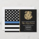 Honre a dedicação e o trabalho de duro de um novo oficial de polícia com este convite de formatura policial personalizável. Apresentando um crachá policial e a bandeira da polícia com riscas brancas e pretas e uma orgulhosa linha azul fina, esta design simboliza força, serviço e sacrifício. O convite é personalizado com o nome do formando em letras douradas, fazer-o como uma lembrança memorável para amigos, familiares e colegas oficiais. Perfeito para celebrar a graduação, promoção ou marco de uma academia de polícia na carreira de um futuro oficial. Convide seus convidados em estilo e mostre suporte para o membro mais novo da comunidade de linha azul fina.