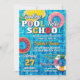 A piscina voltou à festa da escola com adeus piscina olá em uma design de tipografia divertida contra a ilustração de uma piscina com flutuadores de piscina e insufláveis na forma de uma rosquinha salpicada, um abacaxi, uma melancia e um anel de piscina clássico.