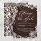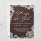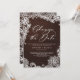 Mude a data! Anuncie para sua família e amigos o adiamento do seu casamento com este cartão de anúncio de casamento rústico. Ele apresenta renda antiga floral e folhagem em fundo de madeira falsa com padrão de renda correspondente. Personalize adicionando seus nomes e outros detalhes. Este cartão de cancelamento de casamento com renda floral também será perfeito como um anúncio de fuga.
