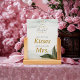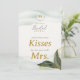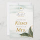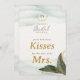 Elegante Greenery Dourado Watercolor Adivinha Quantas Tabletop De Chá de panela De Beijos. Esta surpreendente carta de mesa é a maneira perfeita de adicionar um elemento belo e interativo ao seu chá de panela. Projetado para ajustado perfeito em suportes de placa ou clipe (não incluído), seu design de lado duplo apresenta uma imagem espelhada na parte traseira. Isso garante uma exibição sem falhas de qualquer ângulo, fazer-a de uma peça verdadeiramente completa e elegante. A carta é lindamente personalizada com uma contagem final até o grande dia, em um estilo único no topo. Abaixo, aparece o nome da futura noiva, seguido de "Chá de panela" em tipografia elegante. "Adivinhem Quantos Kisses" "para a futura Sra." são colocados num roteiro elegante, convidando convidados a participar deste jogo clássico. Tudo isso é colocado contra o impressionante design de água e verde-coloração e ouro da coleção. Esta carta elegante serve como um belo pedaço de decoração e um guia de jogos divertidos, garantindo que cada detalhe de sua celebração seja sofisticado e sem esforço.