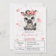 Cute girl baby shower invitation featuring adorable little female zebra wearing a cute pink bow with some love hearts