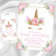 Unicórnio encara um chuveiro de bebês, com um rosto unicórnio floral cor-de-rosa e dourado, com pestanas de ouro bonito e buzinas florais cor-de-rosa e douradas sobre um belo fundo rosa e dourado. Esses adoráveis convites para bebês unicórnios são facilmente personalizados para seu evento simplesmente adicionando seus detalhes. Você também pode alterar a cor de fundo. Este é um design impresso sem brilho real.