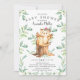 Chá de fraldas bonito com coruja doce de bebê com mãe sentada em um toco de árvore e enquadrada com folhas naturais verdes de aquarela colocadas sobre um fundo branco. Sacudir nosso convite para ver uma folha verde correspondente para um toque especial extra.