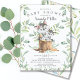 Convite para chá de fraldas bonito, com lobo doce, com a mãe sentada em um toco de árvore e enquadrada com folhas naturais verdes de aquarela, colocadas sobre um fundo branco. Sacudir nosso convite para ver uma folha verde correspondente para um toque especial extra.