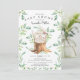 Chá de fraldas bonito com coelho doce bebê com mãe sentada num toco de árvore e enquadrada com folhas naturais verdes de aquarelas, colocadas sobre fundo branco. Sacudir nosso convite para ver uma folha verde correspondente para um toque especial extra.