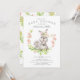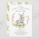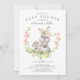 Design de chá de bebê fofo com mamãe e bebê coelho com um delicado louro de flor rosa. Vire nosso convite para ver um verso floral coordenado para um toque extra especial. Visite nossa loja para ver este design para um chá de bebê de meninos, gêmeos e trigêmeos.