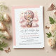 Captivando o convite para o chá de fraldas "Deixe a Aventura Começar" com um adorável gatinho de mesa laranja segurando um ursinho de pelúcia em um balão de ar quente em nuvens cor-de-rosa e estrelas douradas ao redor em aquarelas cor-de-rosa pinceladas. Padrão de estrelas brancas em cor-de-rosa pincelado na parte de trás do convite. Modelos fornecidos.