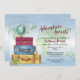 As malas num efeito de aquarela são empilhadas e prontas para o grande movimento. Eles são exibidos contra um mapa de aquarelas em verde e azul. Um globo se senta sobre as malas enquanto um avião percorre o mundo. Use para uma festa de despedida de qualquer tipo, seja um movimento internacional, sabático ou viagem mundial. Disponível com produtos correspondentes.