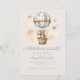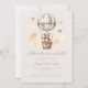 Este chá de fraldas bonito apresenta um doce ursinho de cor d'água em um balão de ar quente, listrado, azul e branco, acima das palavras "Aventura aguarda!" em um roteiro brilhante e azul. Personalize o texto com o nome da futura mãe no script e os detalhes na fonte sans serif em um fundo bege.
