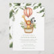 Celebrate a sweet new beginning with this Adventure Awaits safari baby shower invitation, featuring a charming storybook watercolor illustration of safari animals floating in a hot air balloon. A gentle lion, giraffe, elephant, zebra, and playful monkey are nestled together in a woven basket, surrounded by soft greenery for a warm and whimsical look.