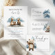 This “Adventure Awaits” baby shower invitation features a peaceful mountain and forest theme. Soft watercolor mountains rise in the background. Pine trees frame the design with natural green tones. The layout feels calm and fresh. It is perfect for a baby boy shower, gender-neutral event, or outdoor-inspired celebration.