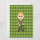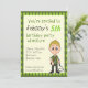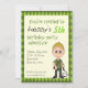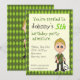 A impressão de aniversário convida com uma ilustração de um aventureiro infantil, sobre um fundo de diamante verde. Ilustrada por Maxi Harmony
