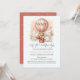 Captivando o convite do chá de fraldas "Deixe a Aventura Começar" com uma adorável raposa segurando um ursinho de pelúcia cavalgando num balão de ar quente branco e rosa listrado. O fundo do céu com aquarela é cor-de-rosa e branco com nuvens brancas com estrelas douradas circundantes. Padrão de estrelas brancas em terracota sólida na parte de trás do convite. Modelos fornecidos.